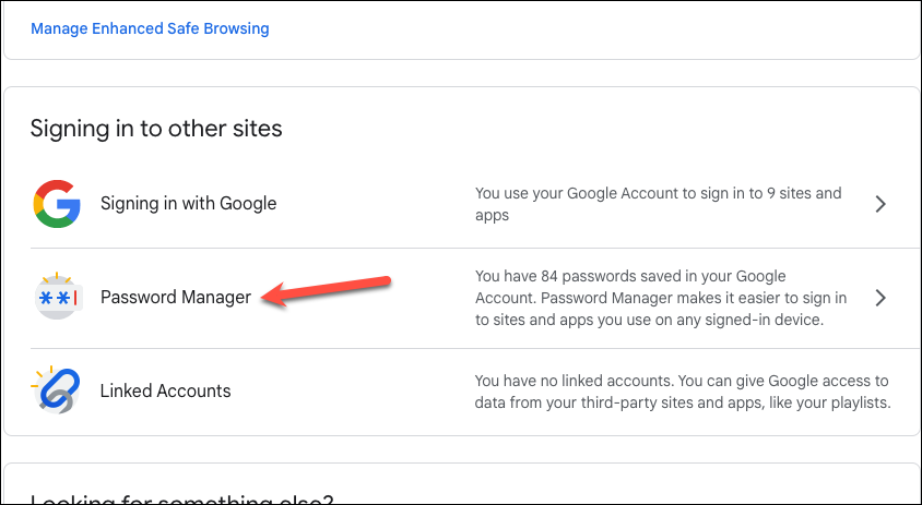 Step 5: On the Security page, scroll down to the section titled 'Signing in to other sites' and click on 'Password Manager'.