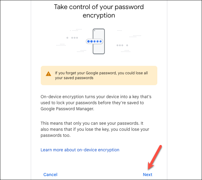 It's important to remember that if you lose your encryption key, you will lose access to all your saved passwords. Additionally, once you enable on-device encryption, this feature cannot be turned off.