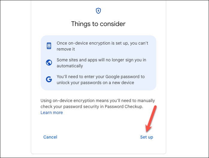 Be aware that enabling on-device encryption might affect certain features. For instance, some websites may not automatically sign you in. Moreover, Google will no longer be able to perform automatic Password Checkups to evaluate the security of your passwords because they cannot decrypt them without the key. You will need to run Password Checkup manually to ensure your passwords remain secure.