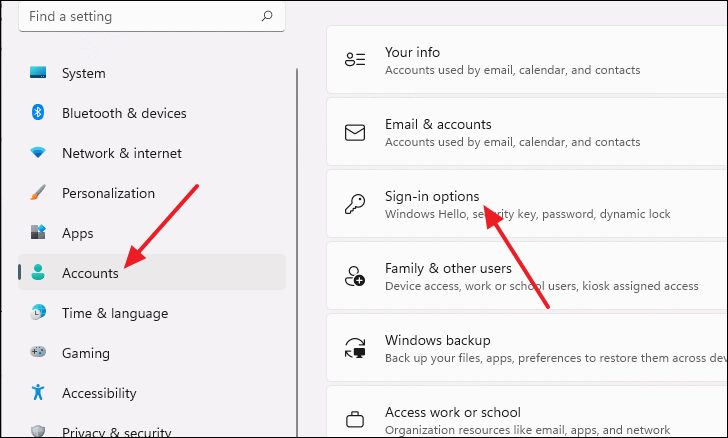 - In the Settings window, select Accounts from the left-hand menu, then click on Sign-in options on the right side.