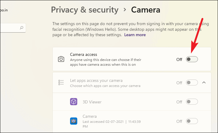 If you prefer to control camera permissions on a per-app basis, Windows 11 allows you to manage which apps can access your camera.
