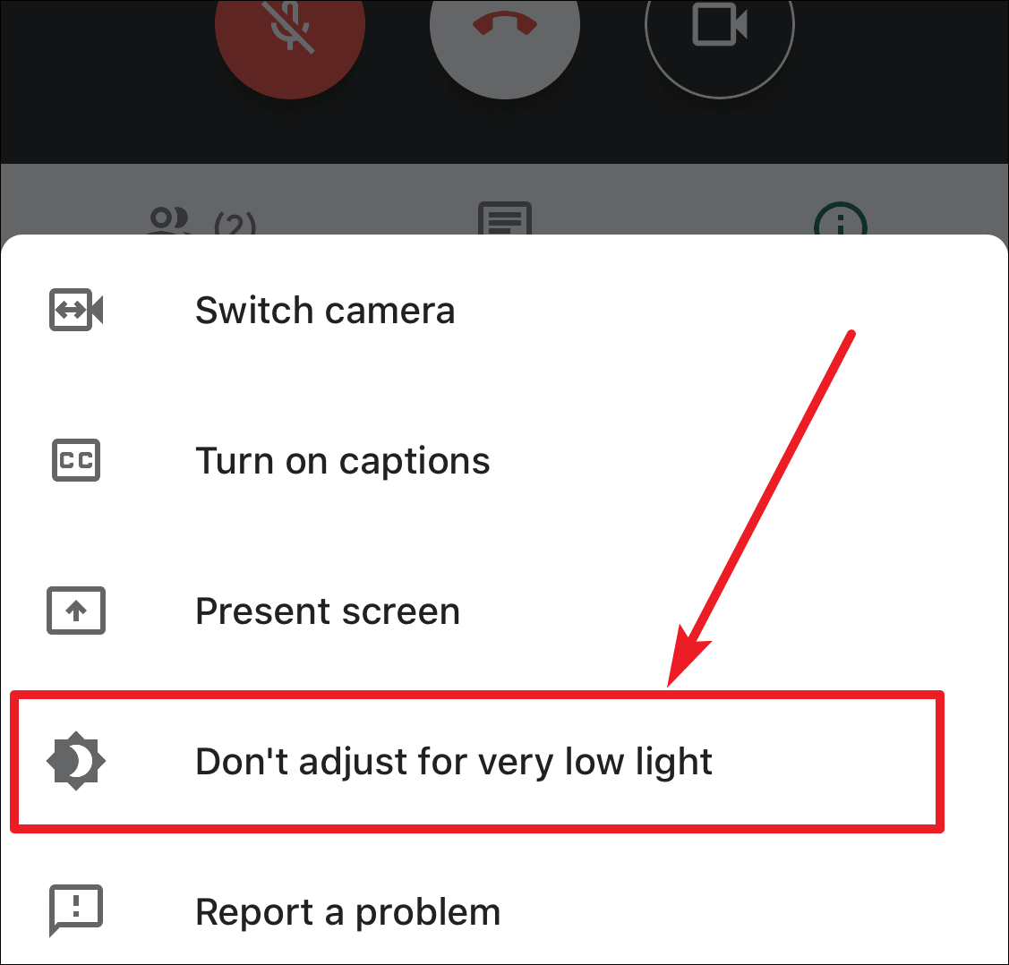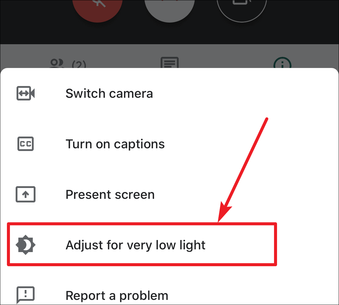 Step 4: In the menu that appears, look for the option "Adjust for very low light." This option appears when Low Light Mode is disabled. Tap on it to enable Low Light Mode.