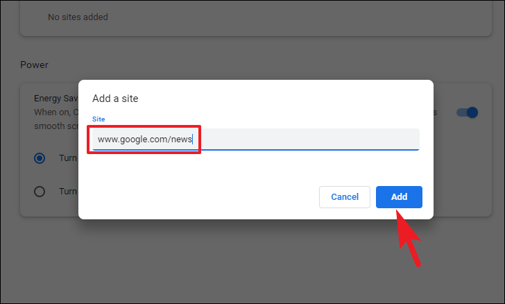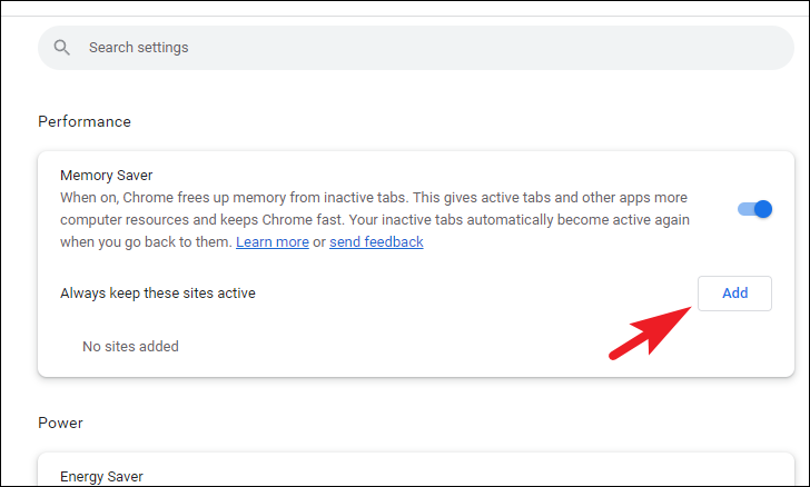 Step 4: If certain websites are affected by Memory Saver and you want them to remain active, you can add them to the exemption list. Click on the Add button next to the "Always keep these sites active" option.