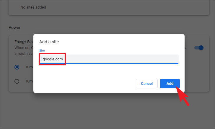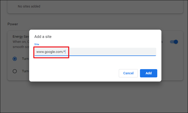 Step 5: In the dialog that appears, enter the URL of the website you want to keep active. You can specify domains, subdomains, or specific pages. For example: