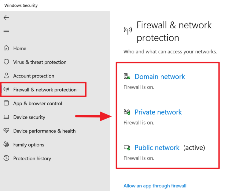 - In Windows Security, select Firewall & network protection from the left sidebar.