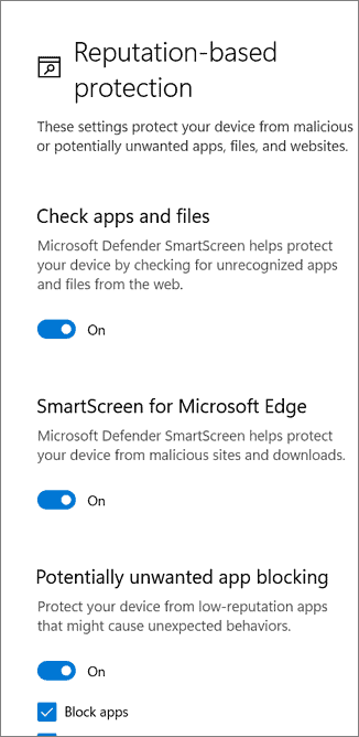 - Adjust the settings based on your preferences. You can toggle features like SmartScreen for Microsoft Edge, Potentially unwanted app blocking, and more.