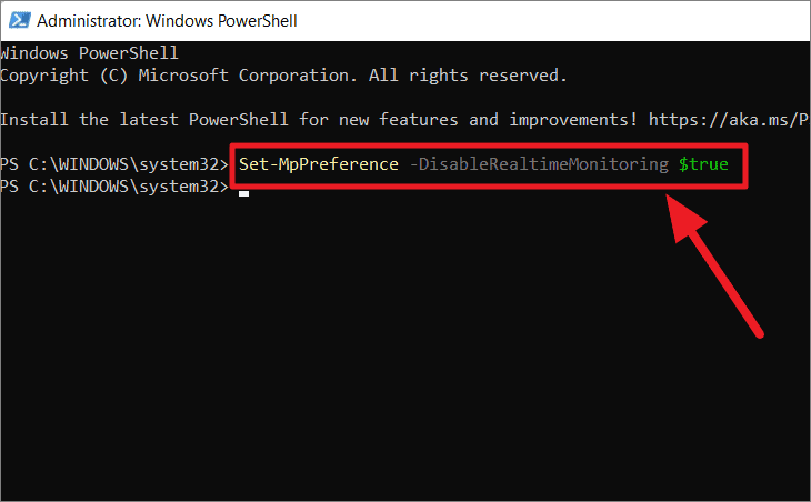 - In the PowerShell window, enter the following command to disable real-time protection: