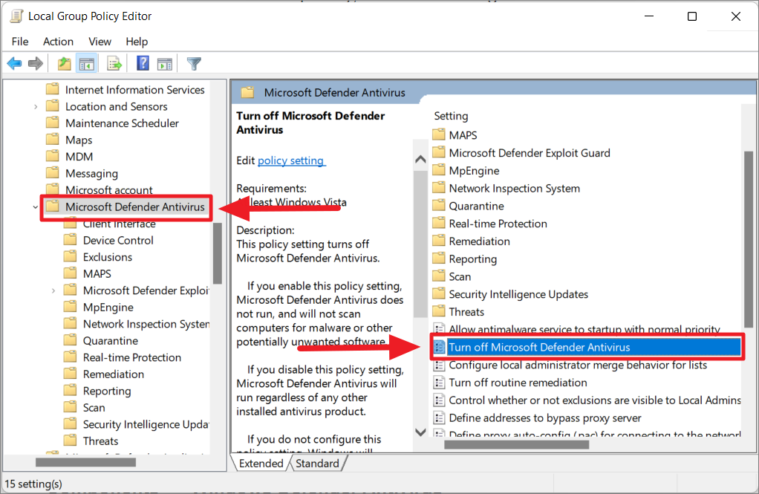 - In the right pane, double-click on Turn off Microsoft Defender Antivirus.