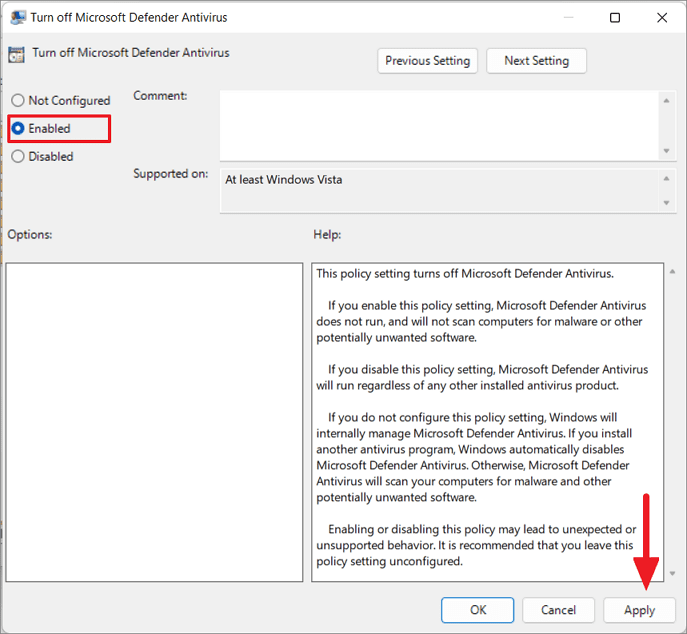 To re-enable Microsoft Defender, change the Turn off Microsoft Defender Antivirus setting to Disabled or Not Configured and restart your PC.