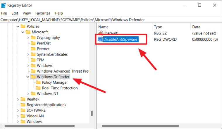 To re-enable Microsoft Defender, delete the DisableAntiSpyware entry or set its value to 0 and restart your PC.