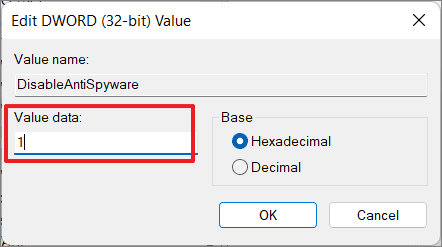 DisableAntiSpywareand set the Value data to1. Click OK.