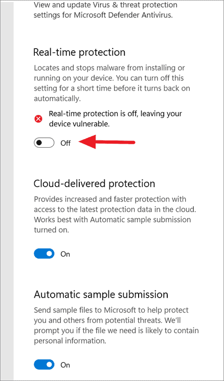 - Toggle off the switch under Real-time protection to disable Microsoft Defender temporarily. If prompted by User Account Control (UAC), click Yes.