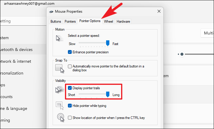 Step 4: To enable pointer trails, check the box next to Display pointer trails. Adjust the trail length using the slider below the option if needed.