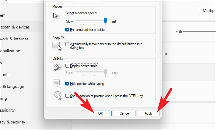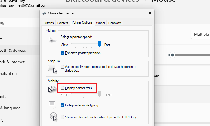 Step 6: To enable mouse pointer trails, check the box next to Display pointer trails. You can adjust the trail length by moving the slider below the option—move it to the left for a shorter trail or to the right for a longer one.
