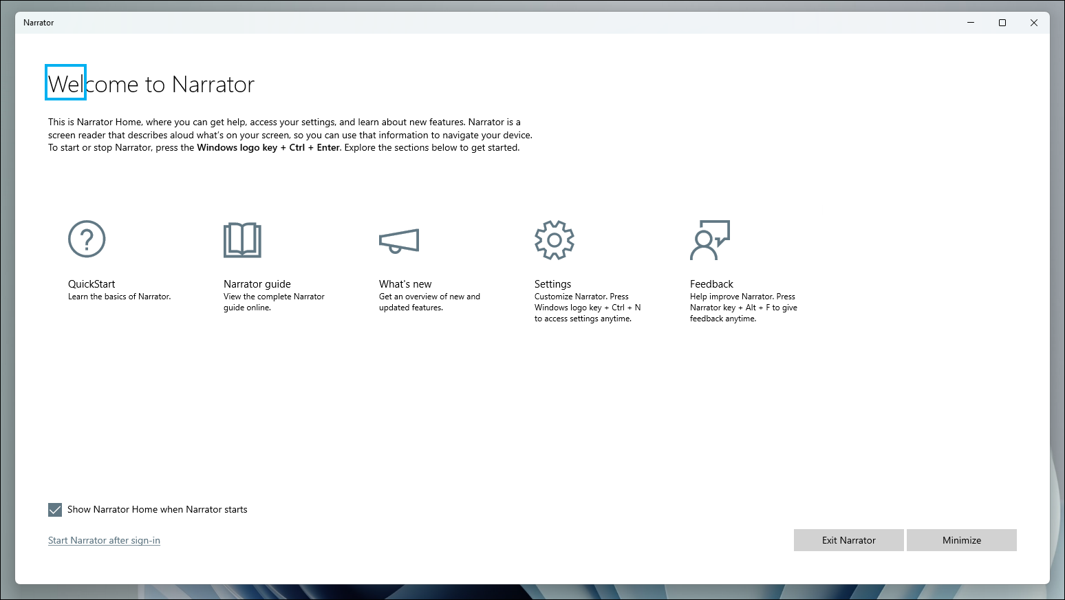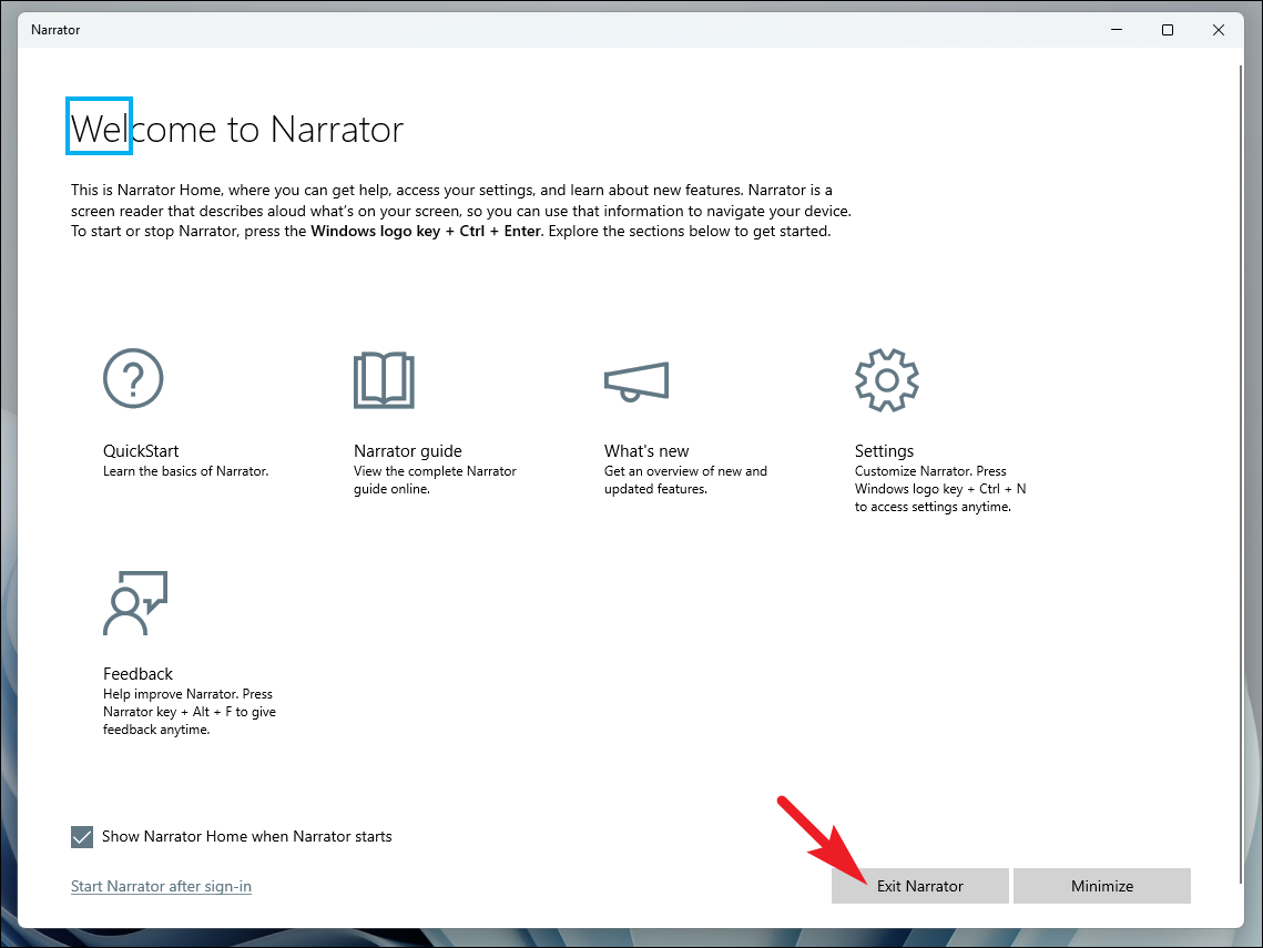 Step 1: To enable Narrator, press the Windows + Ctrl + Enter keys together from any screen. This action will activate Narrator and open the Narrator Home window on your screen. If you do not wish to see the Narrator Home each time it starts, uncheck the option ‘Show Narrator Home when Narrator starts’ located at the bottom-left corner. Alternatively, you can minimize the window by clicking the ‘Minimize’ button to keep it out of your way.