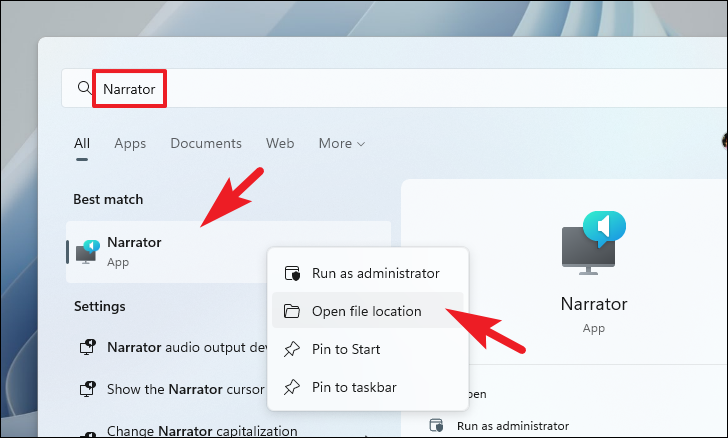 Step 1: Open the Start Menu and type ‘Narrator’ into the search bar. In the search results, right-click on the ‘Narrator’ app and select ‘Open file location’.