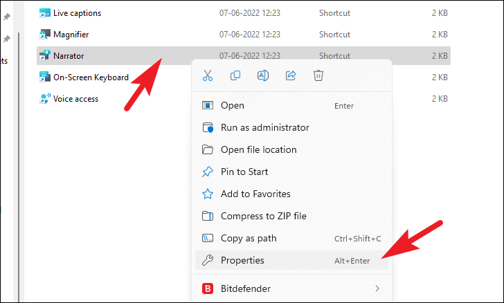 Step 2: In the File Explorer window that appears, right-click on the ‘Narrator’ application and choose ‘Properties’ from the context menu.