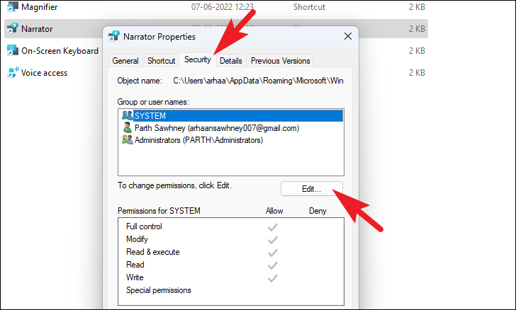 Step 3: In the ‘Properties’ window, go to the ‘Security’ tab and click on the ‘Edit’ button to change permissions. This will open a new window.