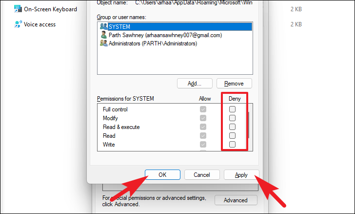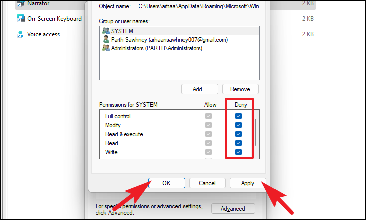 Step 4: Under ‘Permissions for SYSTEM’, check all the boxes under the ‘Deny’ column to revoke all permissions for Narrator. Click ‘Apply’ to save the changes, then click ‘OK’ to exit.