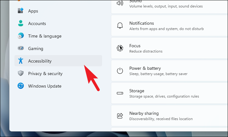 Step 2: In the Settings window, select ‘Accessibility’ from the left-hand sidebar.