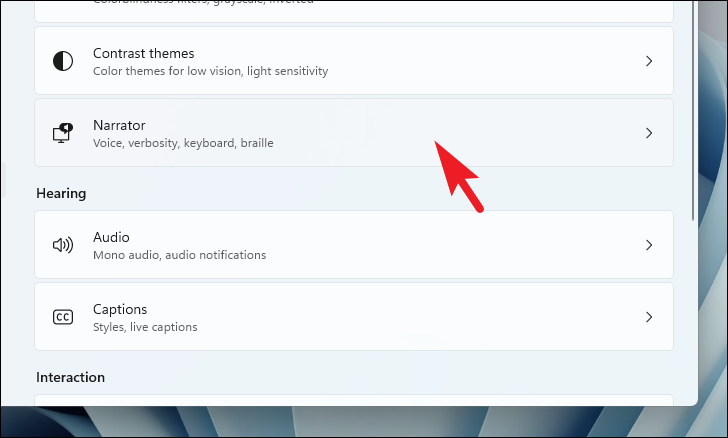 Step 3: On the right side, scroll down if necessary and click on ‘Narrator’ under the ‘Vision’ section.