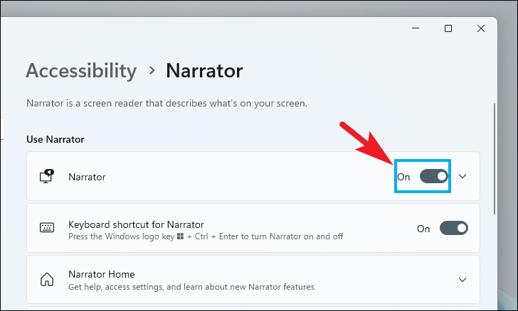 Step 4: To turn Narrator on or off, click the toggle switch next to ‘Narrator’ to switch it to the ‘On’ or ‘Off’ position.