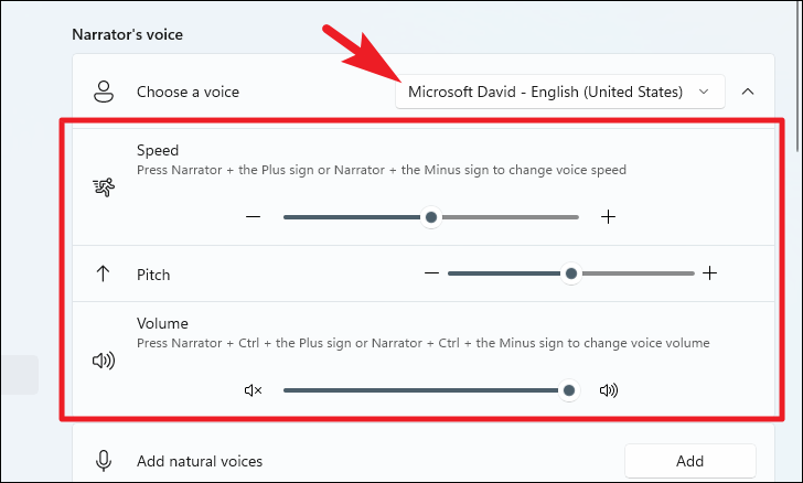 To change Narrator's voice: In the ‘Voice’ section, choose a preferred voice from the ‘Select a voice’ drop-down menu. You can adjust the ‘Speed’, ‘Pitch’, and ‘Volume’ sliders to fine-tune how the voice sounds.