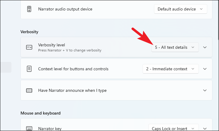 To adjust verbosity level: Under the ‘Verbosity’ section, select your desired level from the ‘Verbosity level’ drop-down menu. This setting determines how much detail Narrator provides about controls and content on the screen.