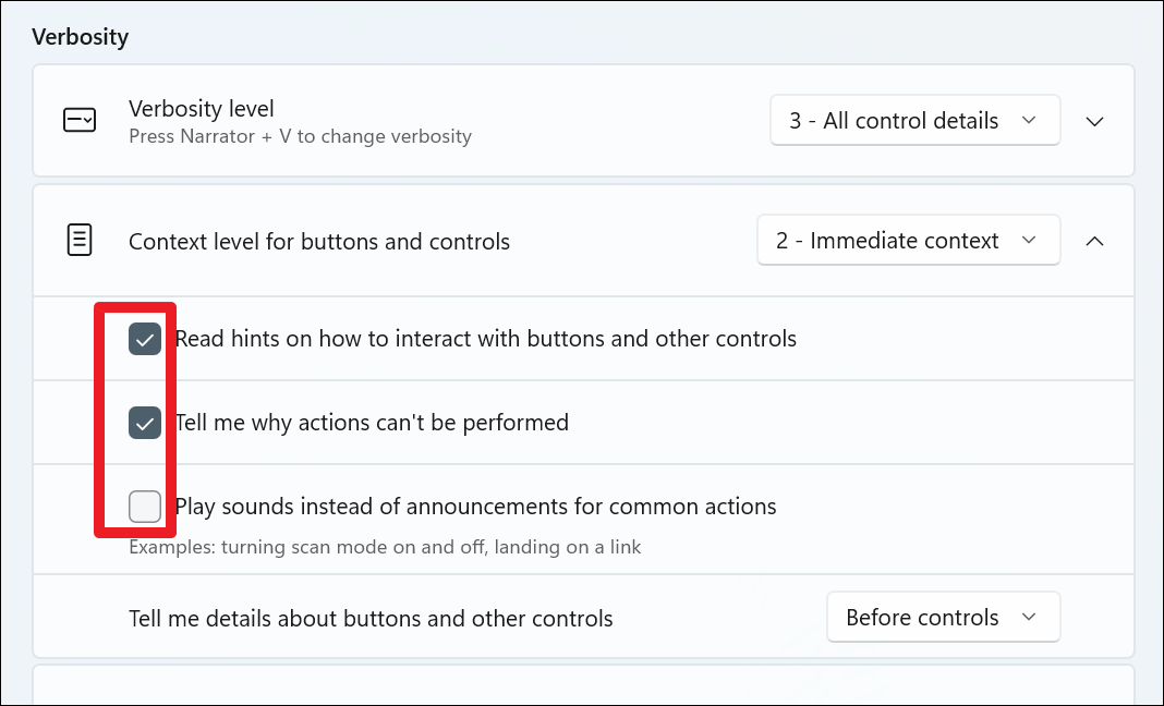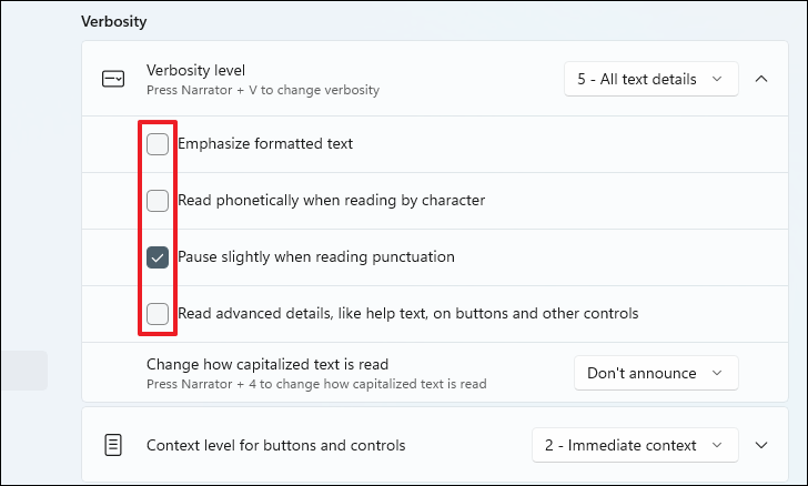 To control how much context Narrator provides for buttons and controls, adjust the settings under ‘Context level for buttons and controls’. Select your preferred context level from the drop-down menu and modify additional options by expanding this section.