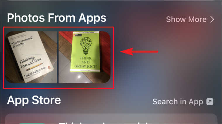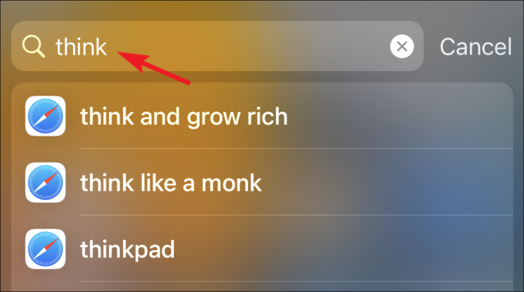 By swiping down on the home screen, I summoned the Spotlight search. Then I typed the word ‘Think’ as I had taken some pictures of the books I wanted to buy and a portion of their title has the word ‘Think’ in it.