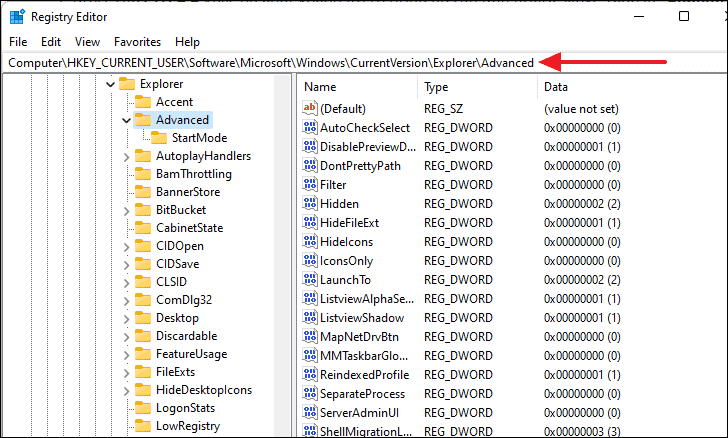 HKEY_CURRENT_USER\SOFTWARE\Microsoft\Windows\CurrentVersion\Explorer\Advanced