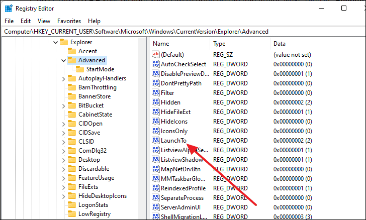 - Locate the 'LaunchTo' string in the right panel.