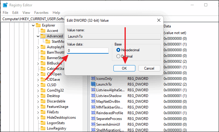 - Double-click 'LaunchTo' and set the 'Value data' to 0.