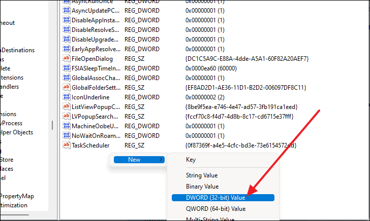 - Select 'New' > 'DWORD (32-bit) Value'.