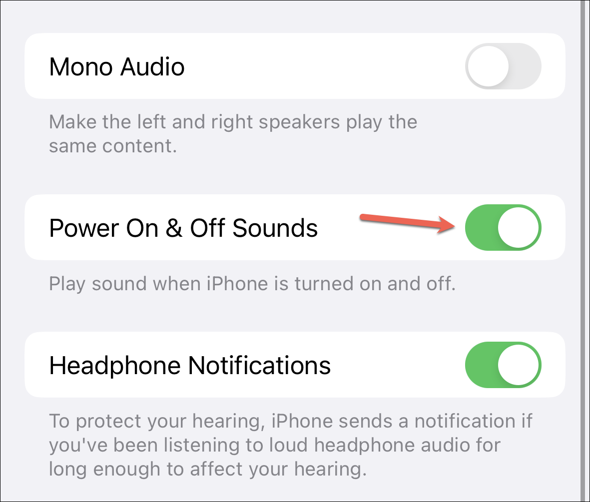 Now, turn the toggle on for ‘Power On & Off Sounds’.