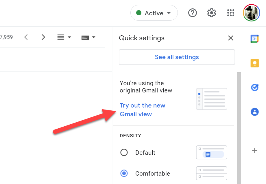 The pane for Quick Settings will open on the right. You’ll see the option for switching to the new view if it’s available for your account. Click the ‘Try out the new Gmail view’ option. Reload Gmail and the new interface will load.