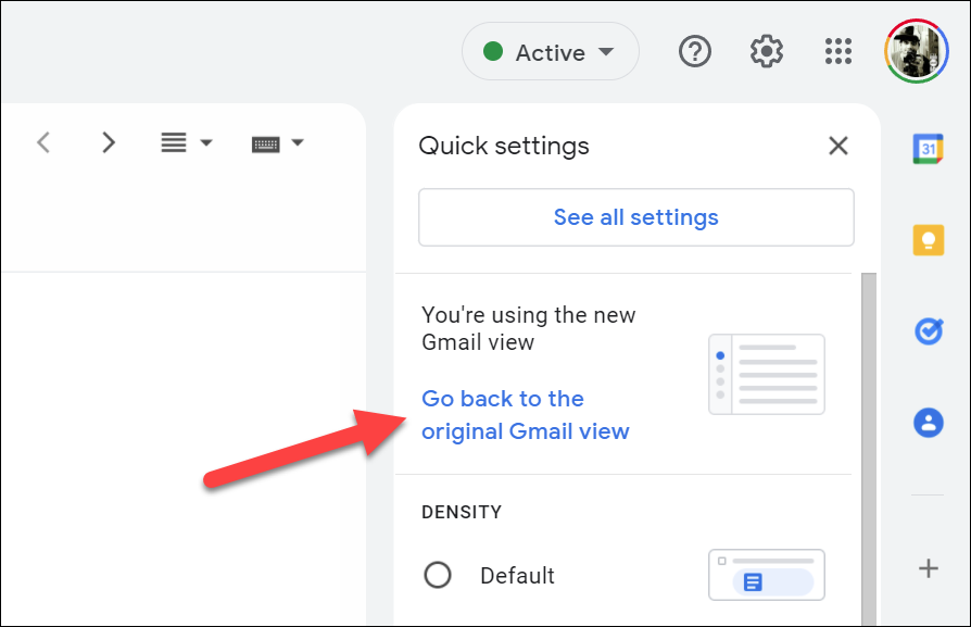 Disabling the new Gmail view. If you find that the new Gmail view is not your cup of tea, you can easily switch back to the original view. Open the Quick Settings pane again and click on the ‘Go back to original Gmail view’ option to disable the new Gmail view.