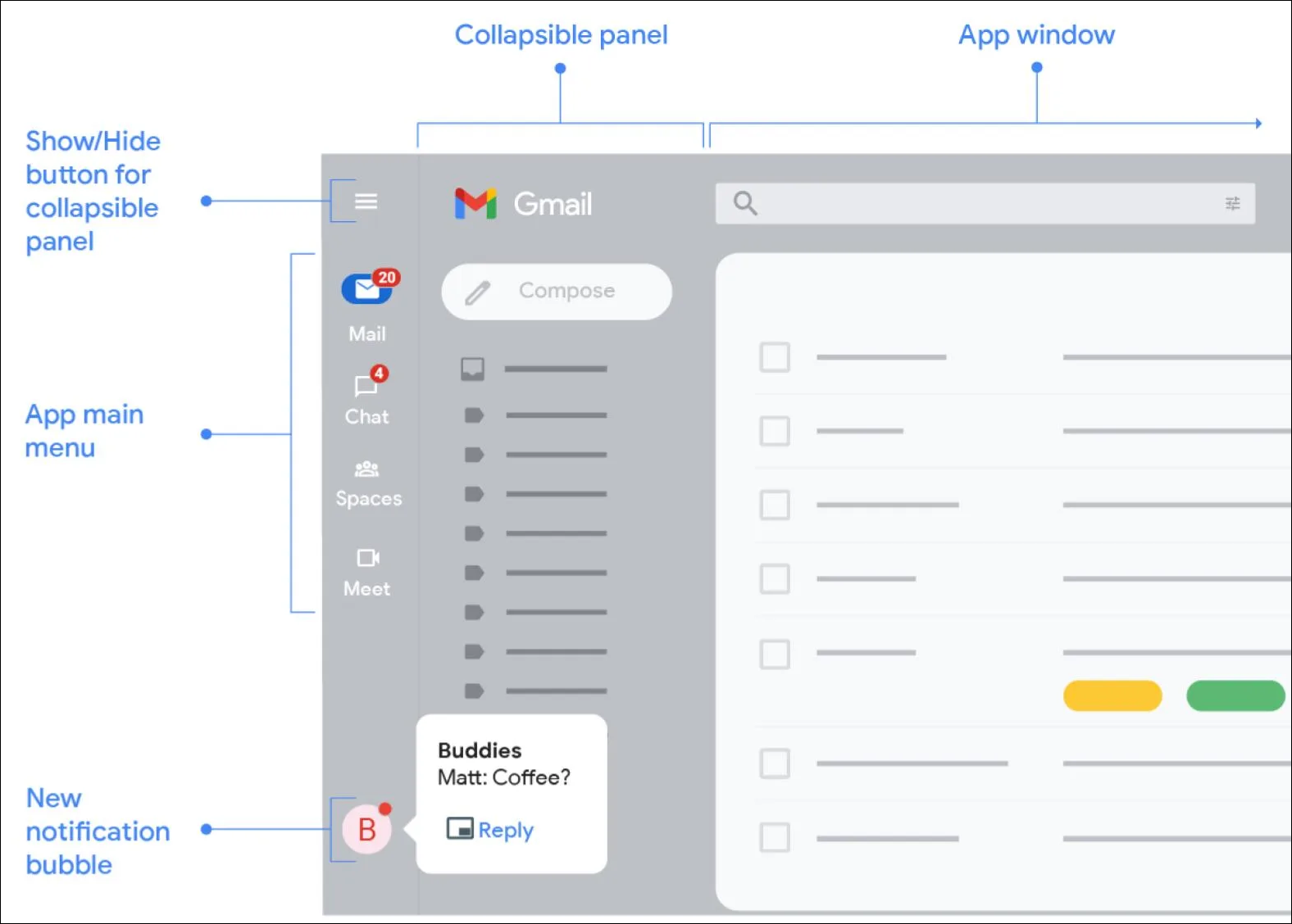 A less intensive iteration of this integration already exists in Gmail in some form. This integration was rolled out as part of Google Workspace – the rebranding move ushered in partly by the way pandemic changed work. In this old Gmail view, Chat, Meet, and Spaces are available in Gmail’s side panel but the scope is limited.