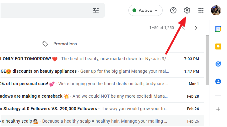 In Gmail, click the ‘Settings’ option (gear icon) in the top-right corner of the screen.