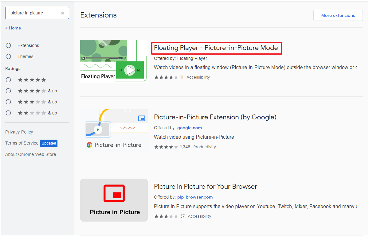 - From the search results, select the Floating Player – Picture-in-Picture Mode extension.