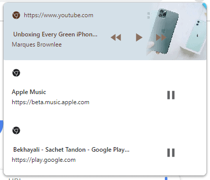 The media controls UI in Chrome displays all media playing in different tabs in a single window. You can play, pause or change track for music or videos playing in any tab on your Chrome from this centralized control menu.
