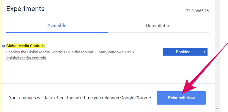After selecting “Enabled” option, you’ll get the option to relaunch Chrome to apply the changes made on the experiments page, which in this case is enabling “Global Media Controls” feature in Chrome.
