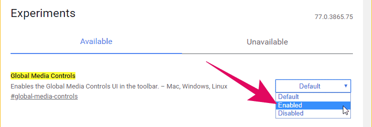 On the right side of “Global Media Controls” flag, click the “Default” button drop-down menu and then select “Enabled” from the available options to enable the feature.