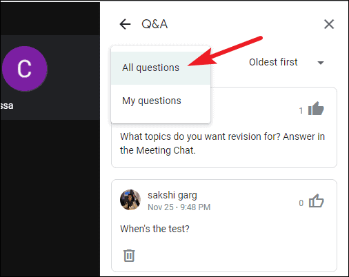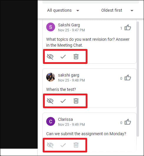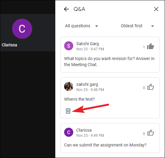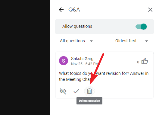 To permanently remove a question, click the ‘Delete question’ button. Moderators can delete any questions in the meeting, even from other participants. This will remove the question from everywhere, including your own panel. But you’ll be able to see it later in the detailed Q&A report Google Meet mails the moderator after every meeting.