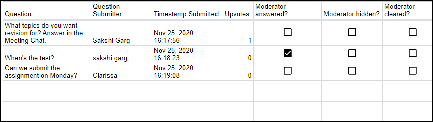There are also a few options available to the moderator to manage the questions for the entire meeting. The moderator can delete or hide any questions in the meeting or mark them as answered.