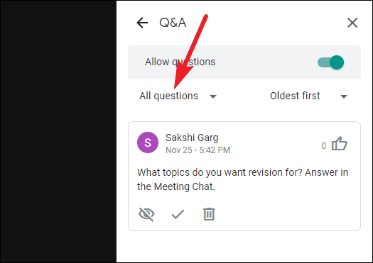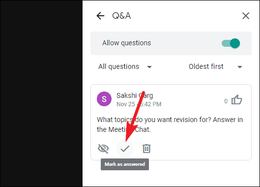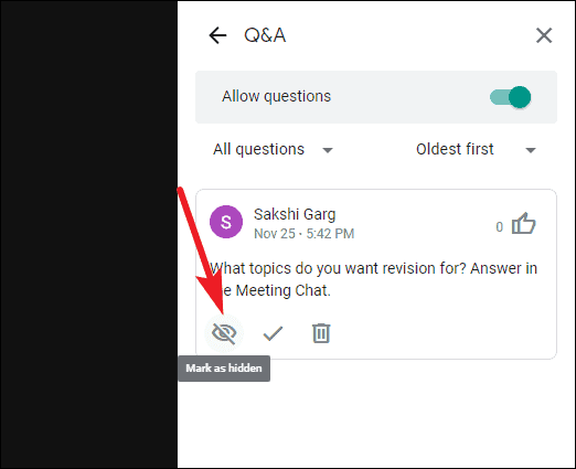 Click the ‘Mark as Answered’ button (checkmark icon) on the question. Marking a question as answered doesn’t hide it. It only lets the participants know that a question has been answered. It’s advisable to mark questions as answered to keep everyone updated.
