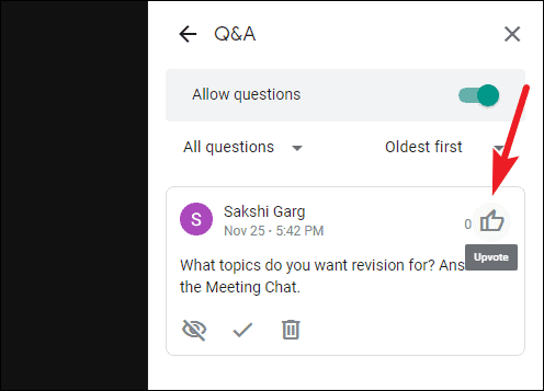Participants cannot hide a question or mark it as answered. They can upvote a question by clicking the ‘upvote’ button (thumbs-up icon). Moderators can also mark questions as answered. When a question is answered, you’ll see a green check next to it.