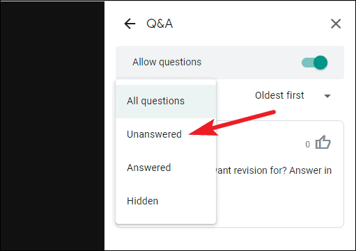 Then, you can filter the questions to only display ‘Unanswered’, ‘Answered’, or ‘Hidden’ questions.