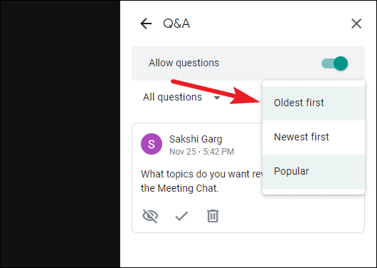 You can also sort the questions either chronologically or by popularity. Click the ‘Oldest first’ option to expand the drop-down menu. Then select either ‘Newest first’ or ‘Popular’ to change the order. When you select ‘Popular’, Meet sorts the questions based on the number of upvotes a question has. That way, you can stay on top of the questions that matter the most to meeting participants.