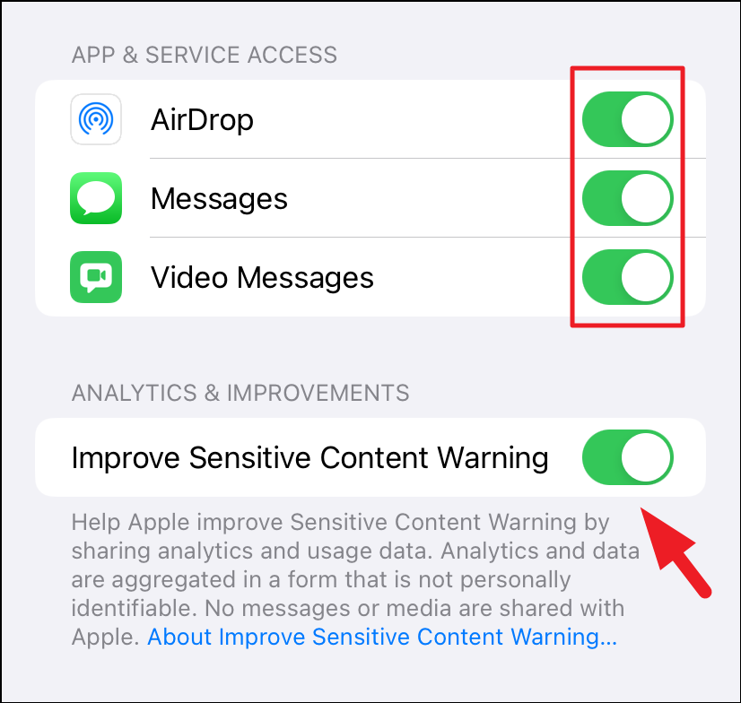 After enabling the feature, apps that currently support the feature will be listed on the screen. You can toggle them 'On' or 'Off' as desired. You can also anonymously send optional data and analytics to Apple to help them improve the feature by clicking on the 'Improve Sensitive Content Warning' toggle.